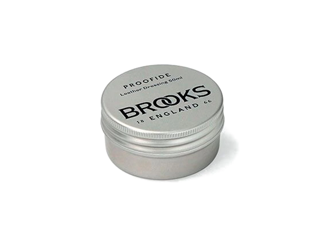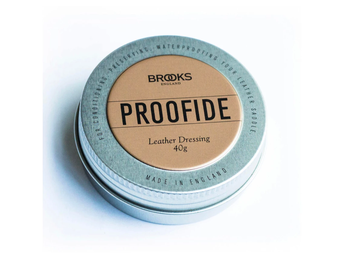 Proofide is the only substance that should be used to care for your Brooks Leather Saddle, specially formulated from natural ingredients to condition, preserve and showerproof. Apply a little of this leather saddle cream to the finished side of the leather. Allow to permeate until dry and then polish off. Also apply Proofide to the underside of the saddle, but leave this coating on to protect against dirt and moisture. It should be used several times during the βbreaking-inβ period and periodically (3-6 months) thereafter. It is recommended to polish the saddle with a soft cloth before first use.
