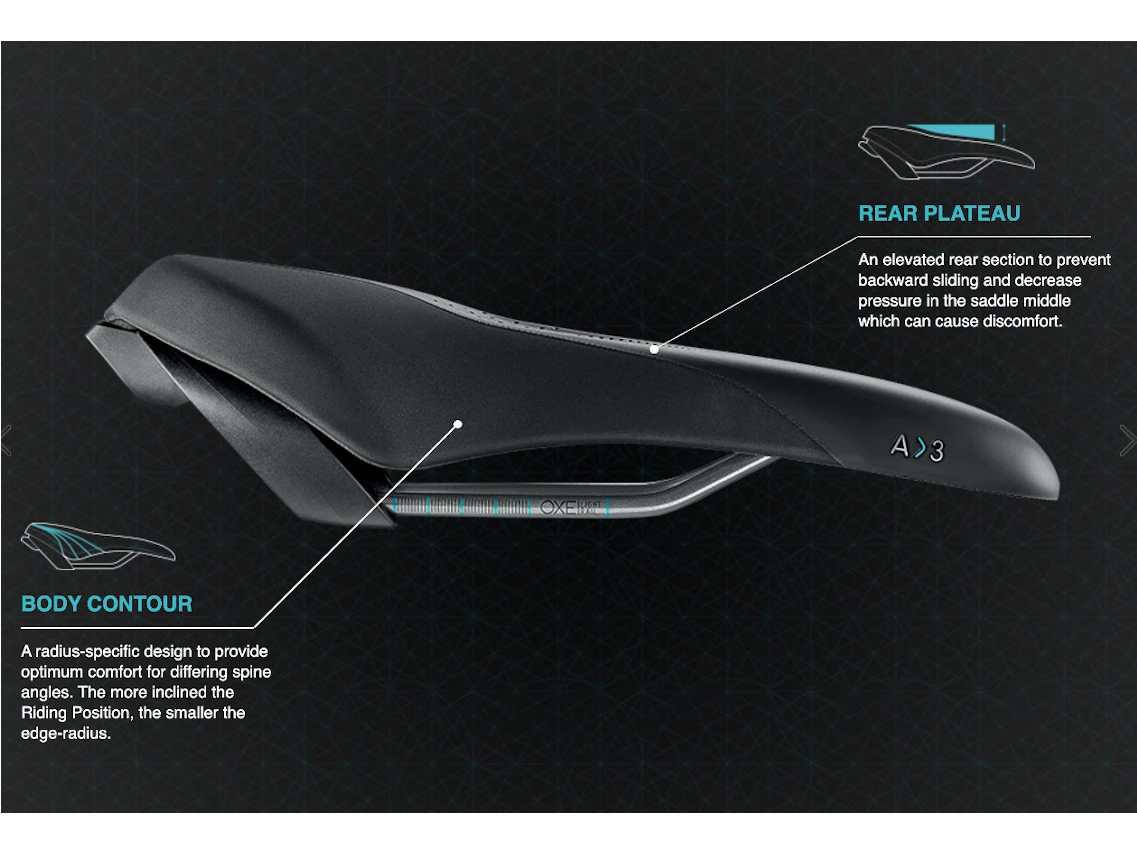 Body Contour –Β A radius-specific design to provide optimum comfort for differing spine angles. The more inclined the Riding Position, the smaller the edge-radius.
